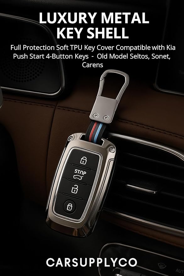 CARSUPPLYCO Luxury Metal Key Shell with Keychain | Full Protection Soft TPU Key Cover Compatible with Kia Seltos, Sonet, Carens (Push Start 4-Button Smart Key – Old Models) Bonus Car Freshner Included
